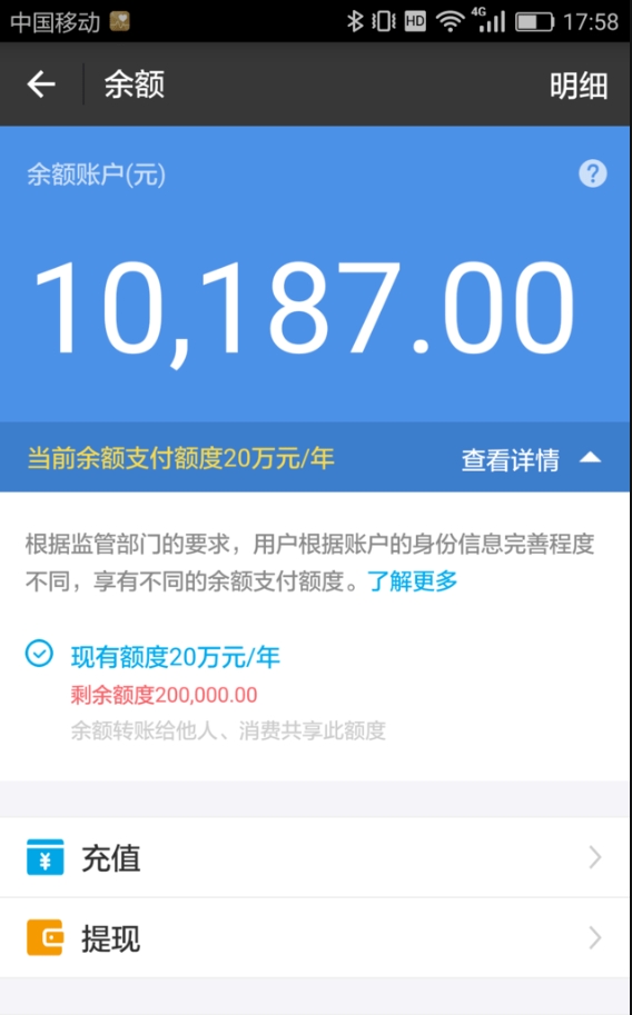 支付宝v3:单笔额度限制2万元,年额度20万,日交易额度10万元,